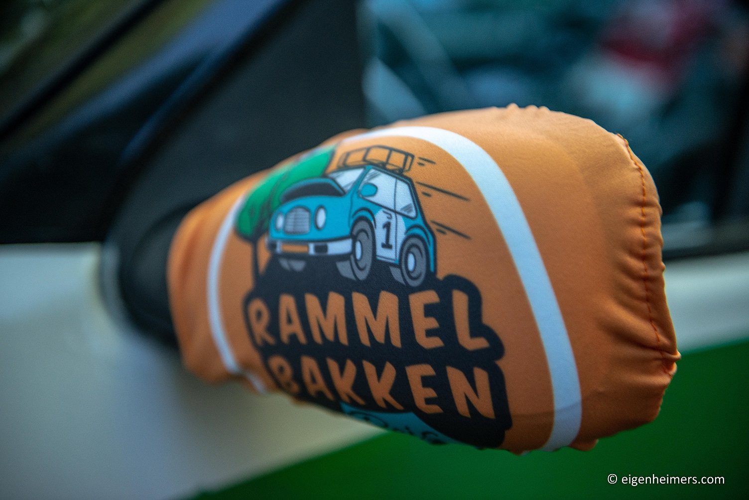 De spiegelhoezen zijn oranje en bedrukt met het logo van de Rammelbakken Reis.